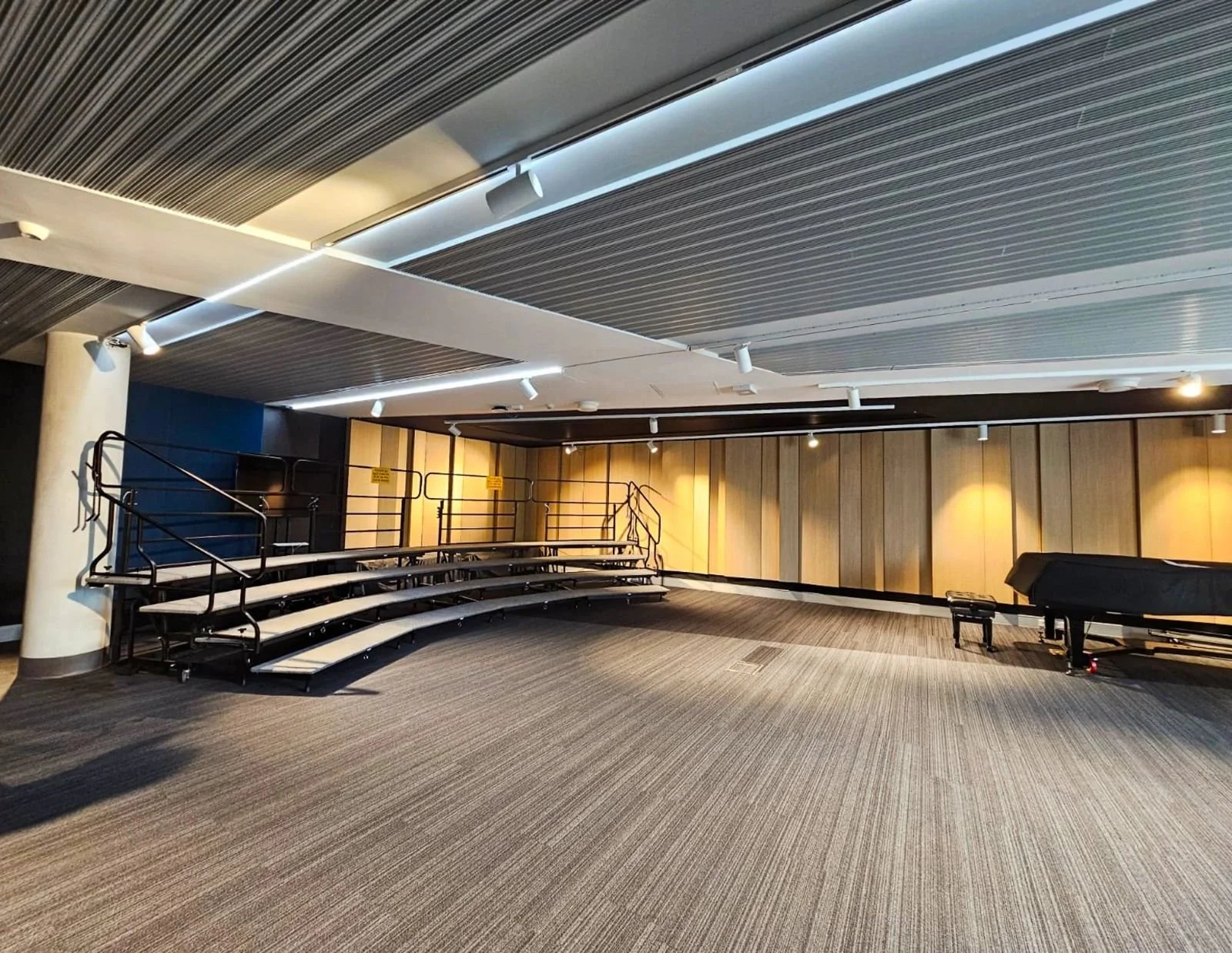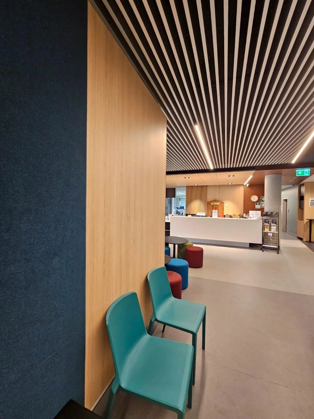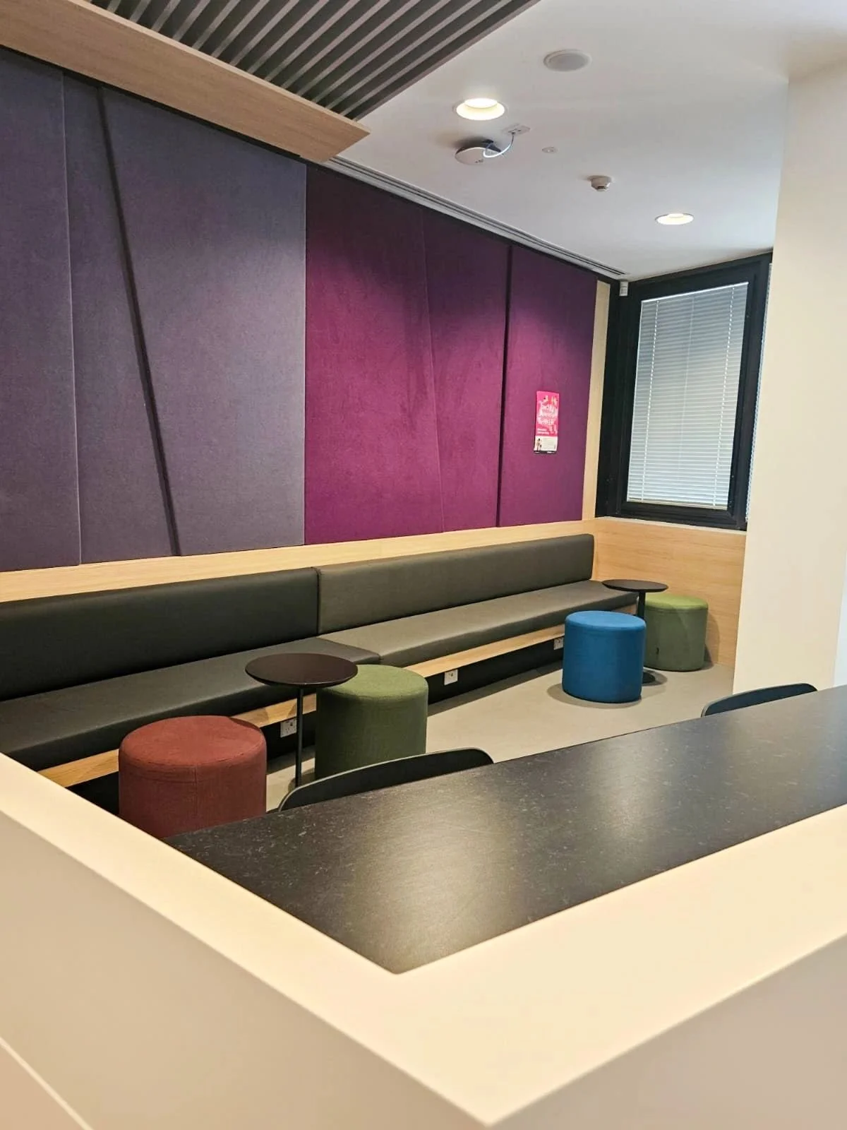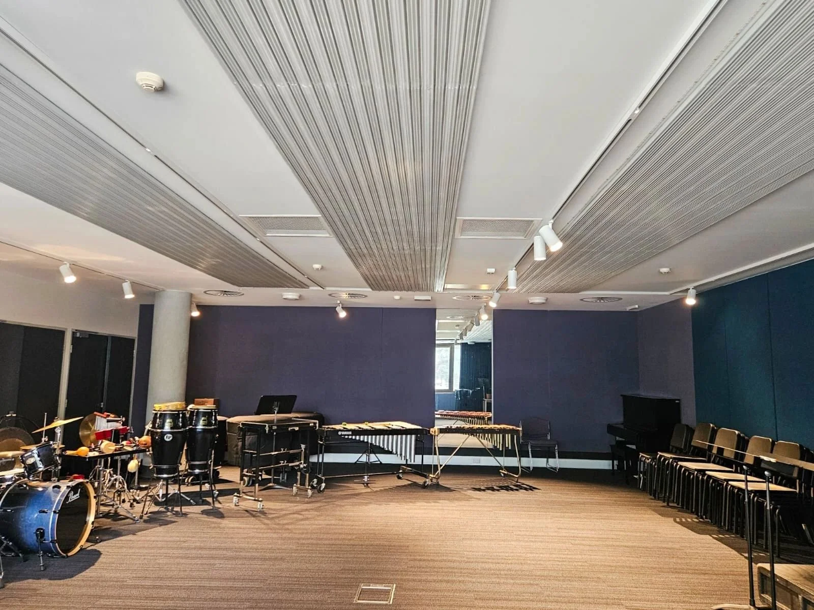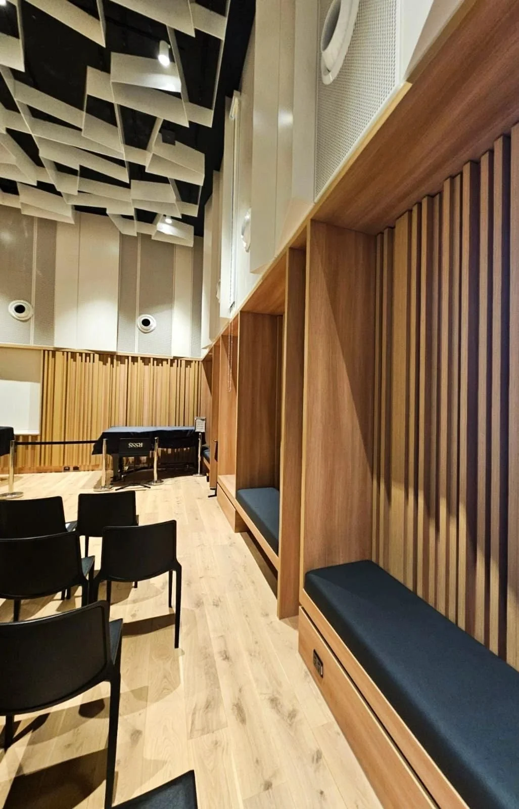 Our joinery scope included a reception area, kitchens, rehearsal spaces, practice studios, and bespoke anodised aluminum metalwork. We also supplied customised Autex Quietspace acoustic panels to the majority of rooms to achieve acoustic requirements.